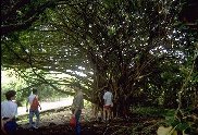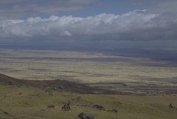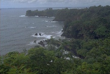 海食崖。ハワイ島の北東部は北東貿易風の風上で、山の斜面を吹き上る湿った風によって雲が生まれ、降水量が多い。ハワイ島は東西で熱帯雨林〜砂漠と、極端な気候の差がある。