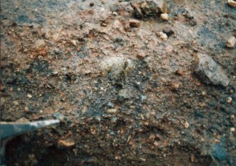 湖岸のレキ層に露出した、かんらん岩ノジュール。主にスピネル・レールゾライト。