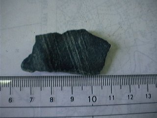 粘板岩slate。薄い砂泥互層が弱い変成作用を受けている。層理面ではなく、スレート劈開(へきかい)の方向に割れるので、このような砂と泥の縞模様のよくわかるレキができる。