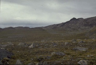 モレーンに覆われて、その境界はここでは露頭で観察できないが、植生の違いで表成岩とアミツォク片麻岩の境界が明瞭に表れている。画面右の黒い岩石が細長く突出した部分は、 約35億年前に貫入したアメラリク岩脈群の一部。当時の”大陸”の証拠