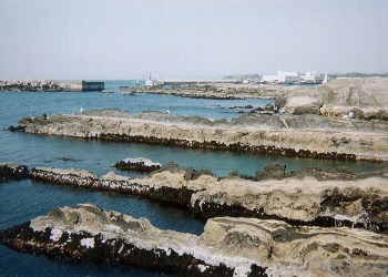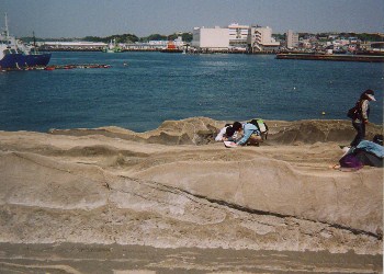 城ヶ島バス停から西に進み、鐘ヶ崎付近。走向傾斜の測定の練習。三崎港を正面に望む。