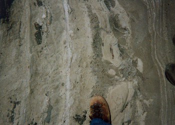 生痕化石(画面やや左上からの白い点々)と層内での変形(右側の白い地層の角礫化)。