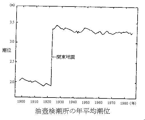 近傍の油壺検潮所の記録。関東地震に伴って隆起したことがわかる。