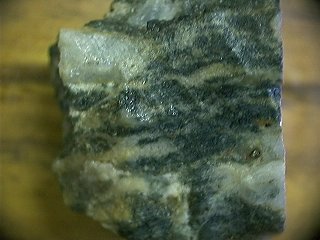 別子の藍晶石は、1954年頃初めて報告された(→文献・・)ものです。三波川変成帯内部にとりこまれた、変成はんれい岩体(ざくろ石角閃岩主体)の、もともと斜長石(灰長石)の多かった部分が、変成作用で藍晶石を含む岩石に変化したものと考えられます。