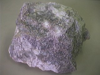 リチア雲母の集中した脈。石英・長石質の母岩に入っている。リチア電気石、少量のリチア輝石などを伴う。横幅約10cm。 地文研地質部標本。