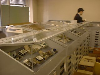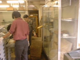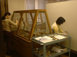 常設展示に向けて、標本を展示ケースに仮配置しました。(2000.3.31)