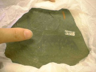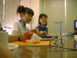 スタジオで使う三葉虫(バージェス頁岩)を手にして楽しそうな濱田先生。 この標本は、かつて「地球大紀行展」に展示されたもの。奥は第9回担当のPD鈴木知子さん。 アノマロカリスの化石。東北大資料館からお借りしたもの。 標本を見て、「気持ち悪ーい」。 VTR部分を説明する鈴木さん。 箕輪さん。 SD石倉さん(左)と谷中さん(右)。