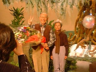 最後の俯瞰映像を取り終えて、濱田先生に花束贈呈、記念写真を奥様と。