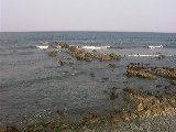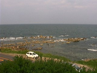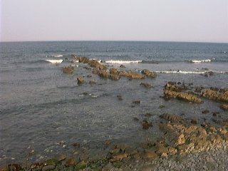磯崎の海岸。シルト岩の部分はやわらかく、岩礁が少なくてへこんでいる。