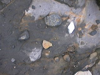 レキ質砂岩の部分。レキには酸性火山岩レキ(ルーペ左)が見いだされ、白亜紀火成活動との関連を考えさせられる。