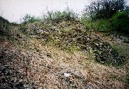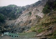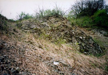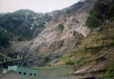 周囲の泥質岩より堅い岩石なので風化・浸食から取り残され、突出している。地層のかたちをなさずに断片的な、切れ切れの岩体が泥砂質岩にはさまっていることが重要。つまり、ここで堆積した岩石ではなく、再移動したものであることが読みとれる。(採石場側方)