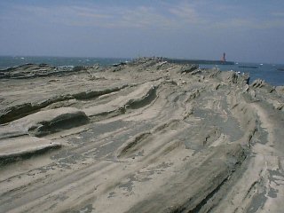 城ヶ島の西端、灘ヶ崎。垂直に近い南傾斜の三崎層。
