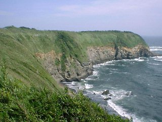海岸段丘。緑に覆われた上半分は陸上堆積のローム(火山灰)。