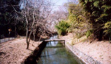 画面奥(上流側)で右に曲がっている。立川断層によって西側がやや高くなっているため、玉川上水は開削時からそれを迂回するようにつくられている。