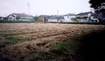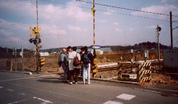 正面の雑木林に至る坂道に断層の垂直変位が現れている。画面左で立川断層は八高線を横切るが、そこは切り通しになっている。 同じ踏切にて。遠くに狭山丘陵を望む。
