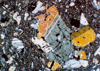 溶岩や火山灰のような、火山岩の場合は、低温で出てくる鉱物がのびのびと結晶化する前に冷たい地上に放り出されて、こちーんと凍ってしまったものだと思うこともできます。だから、かんらん石、輝石、斜長石のような、高温でも出る鉱物が斑晶として目立って、その間を石基が埋める構造、つまり斑状組織になるわけです。