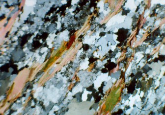 黒雲母の干渉色。高次の干渉色でさまざまな色が出ている。
