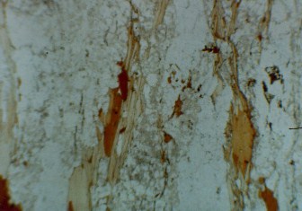 オープンニコル、褐色の部分が黒雲母。次の写真と色を比べてください。