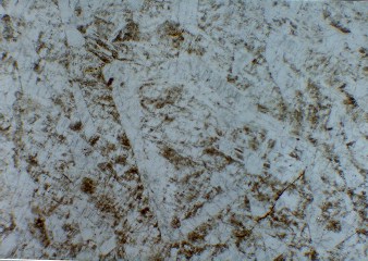 オープンニコル。やや汚れた感じの”地”の部分がカリ長石。やや輪郭が浮き上がる透明な部分が石英。
