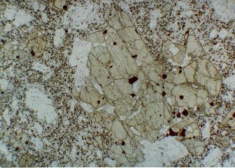 オープンニコル。単斜輝石の集合斑晶。マグマだまり内部で、浮いていたいくつかの斑晶が互いに接着して、このように大きな斑晶に成長していることがある。