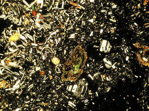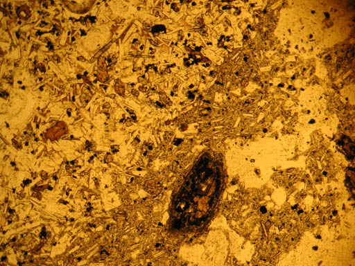 石基の組織の異なる部分が接している角閃石安山岩の薄片。境界が不規則なので液体同士で接していた、おそらくマグマ混合を示す部分。中央は角閃石の斑晶が分解しかかっているもので、高温のマグマの注入により輝石や磁鉄鉱などの集合体に分解しつつある状態を保存しているのだと思う。
