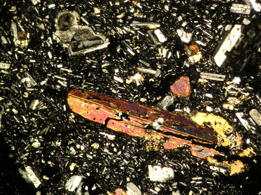 クロスニコル。色だけでなく石基の斜長石の大きさ、結晶度が全く異なるのがわかる。