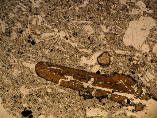 大きな角閃石斑晶。比較的保存がよいが、リムには鉄鉱物が生じているのか、輪郭が黒い。