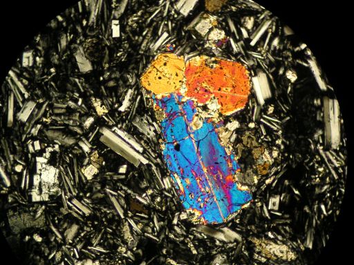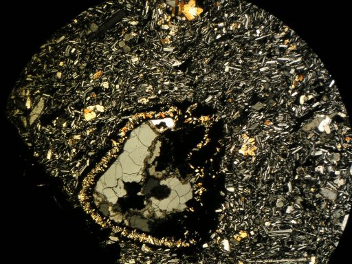 かんらん石斑晶。捕獲結晶ではなく、マグマ本来の斑晶。石基は斜長石、かんらん石の微斑晶、bronzite(古銅輝石)、鉄鉱物…。