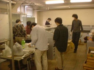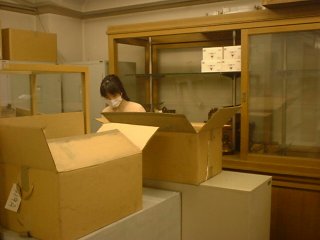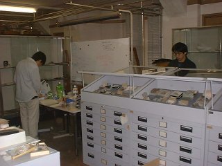 常設展示に向けて、標本を展示ケースに仮配置しました。(2000.3.31)